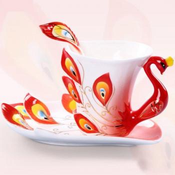 Artistic Peacock Design Ceramic Tea Cup with Plate