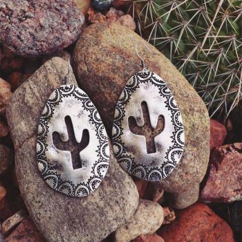 Silver Metal Cow Tag Earrings with Cactus and Floral Engraving