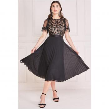 Goddiva Embroidered Top Chiffon Pleated Midi - Black