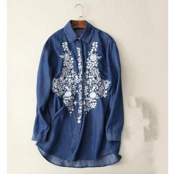 Loose Long Sleeve Denim Blouse with Flower Embroidery
