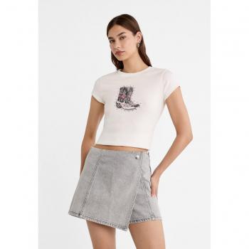 Stradivarius Ecru Studded Print Fitted Tee M