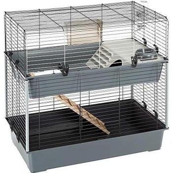 A robust black Ferplast Rabbit 140 cage measures 140×71×51 cm, featuring a sturdy metal frame, secure latch, side ramp entry and an integrated feeder with water bottle, plus a cozy nest box for rabbits or small rodents.
