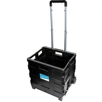 Foldable steel platform trolley with a hinged handle, two fixed wheels and two swivel casters, built to carry 300 kg. Its rubber‑coated rim prevents scuffs on floors while offering smooth, stable transport.