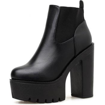 Gdgydh Black Leather Womens Boots Spring Autumn Basic Solid Color Ladies High Heeled Shoes Platform Square Heel Model Party