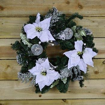 Premier White Poinsettia Wreath (60cm) - Silver Balls & Flocked Snow Effect