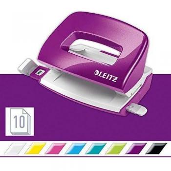 The Leitz Mini Hole Punch in metallic orange punches ten sheets at once with a precision guide bar marked for common formats, offering sharp holes and a sturdy metal body that resists wear while adding a bright pop of color to any office setup.
