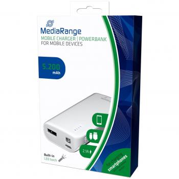 The MediaRange MR745 power bank in white offers 2600 mAh of lithium‑ion capacity with a single USB‑A output, delivering steady 5V charge to phones and tablets while remaining slim enough for pocket use.