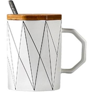 matte geometric mug with bamboo lid metal spoon, line ceramic cup mugs microwave milk cup Home Office Drinkware 400ml