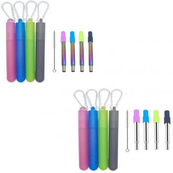 4 Sets of Stainless Steel Reusable Folding Three-Section Straws with Nozzle and Cleaning Brush in Plastic Holder with Key Ring