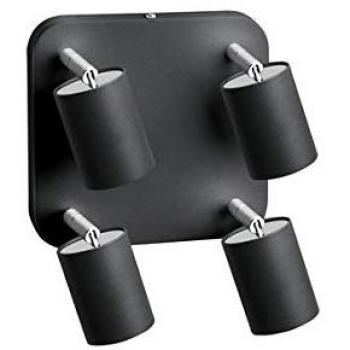 Vintage-inspired four-head ceiling spotlight in black and brass metal, with adjustable swivels to aim light precisely where you need it. Uses four E14 bulbs for a warm, retro glow in living rooms, hallways, or bedrooms.