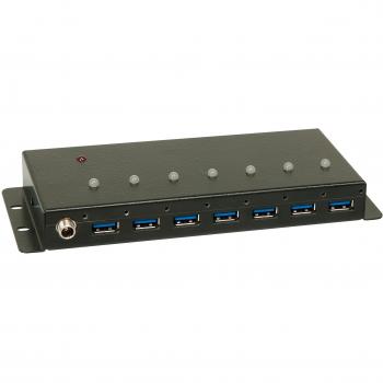 Elevate your setup with a slim black USB 3.0 hub that offers seven fast data ports plus two powerful 2.4 A charging slots, all powered by an included 12 V adapter and protected by anti‑static technology for safe use on Windows, macOS, or Linux.