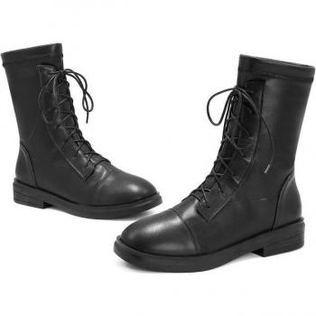 QUTAA Ladies Mid Calf Lace Up Boots - Comfortable Round Toe Low Heel, Stretch PU Leather, Size 34-40