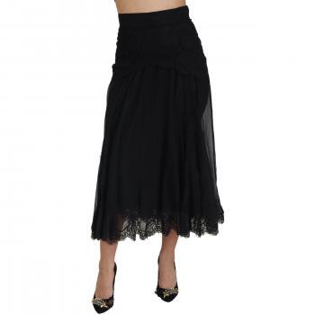 Black Silk Lace Trim High Waist Midi Skirt