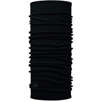 Versatile lightweight Merino wool tubular scarf in solid black. One size fits all, offering soft warmth, breathability, and moisture-wicking performance for neck, head, or face coverage in cold weather.