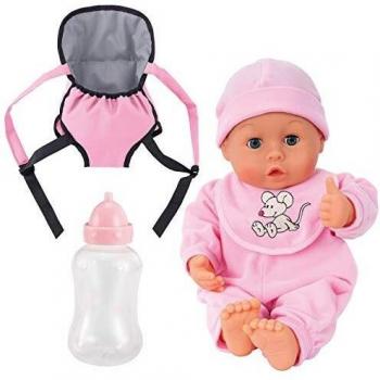 My First Words Baby Doll Carrier Set by Bayer – Pink & Mouse Outfit, 13" Doll, 24 Baby Sounds, Bottle Included (Ages 3+)